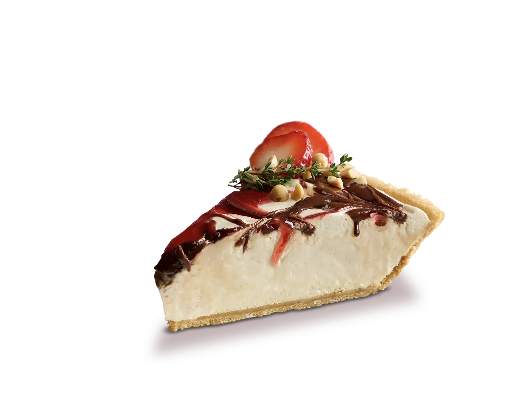 A creamy whipped peanut butter cheesecake filling is swirled with melted chocolate and strawberry thyme-infused jam and topped with fanned out strawberry slices, crushed peanuts and thyme sprigs.