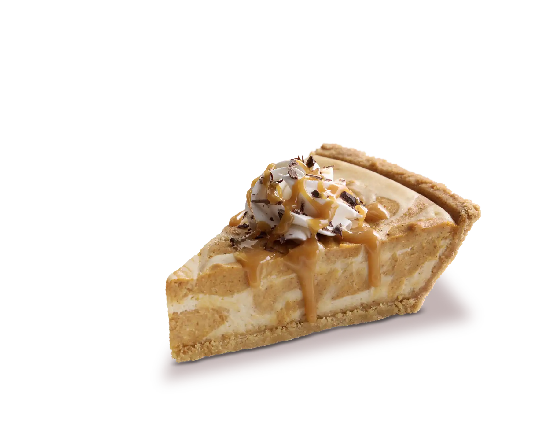 A rich cheesecake base is swirled with LIBBY'S® Pumpkin filling and warm pumpkin spice, then baked in a graham Keebler® Keebler® Ready Crust®. Each slice reveals marbled ribbons of pumpkin and cream, while the top is finished with whipped cream, a light drizzle of caramel sauce and a scattering of chocolate shavings.