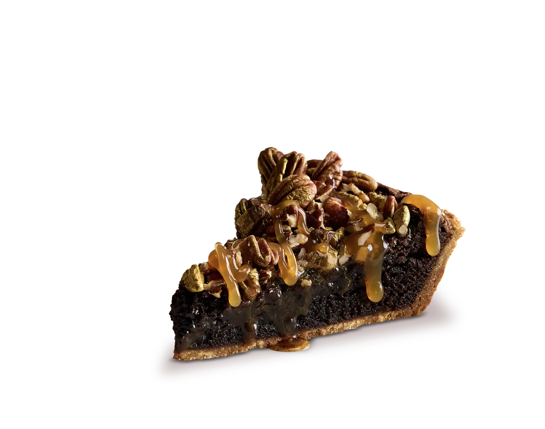 Fudgy brownie baked into a graham crust, crowned with gooey salted caramel drizzle and edible gold shimmered toasted pecans.